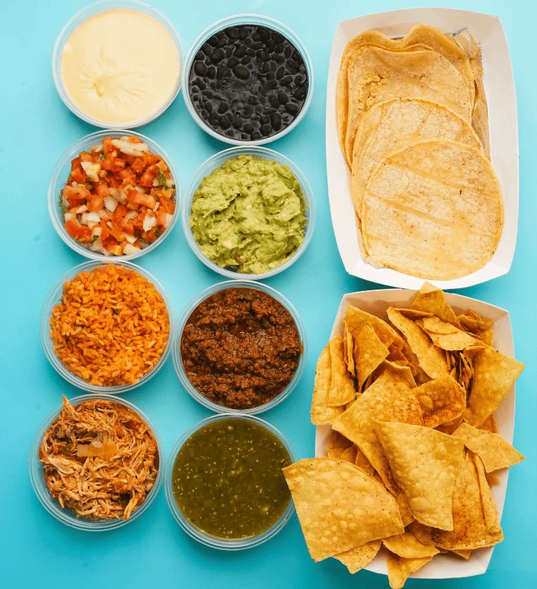 This family taco box includes 3 proteins (8oz each), 12 tortillas, Chips, Salsa (8oz), Rice (16oz), Beans (16oz), and a choice of 8oz of Queso, Pico or Guac.